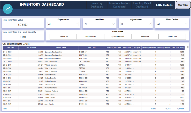 • Grn_Transaction: This table tracks goods received in inventory. It includes details like purchase order numbers, vendor names, shipment quantities, receipt dates, and item prices. It helps monitor inventory updates and receive goods efficiently.