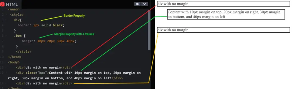 <div class=”box”>Content with 10px margin on top, 20px margin on right, 30px margin on bottom, and 40px margin on left</div>