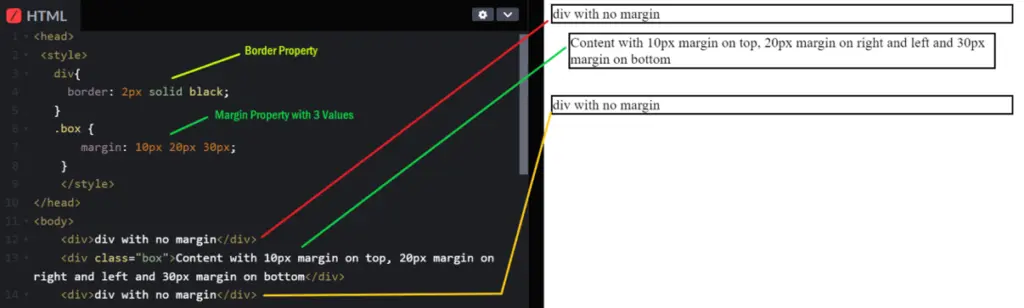 <div class=”box”>Content with 10px margin on top, 20px margin on right and left, and 30px margin on bottom</div>
