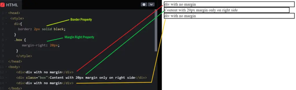 • .box{margin-right: 20px;}: Adds a 20-pixel margin to the right side of elements with the box class. This rule only affects elements within the class box.