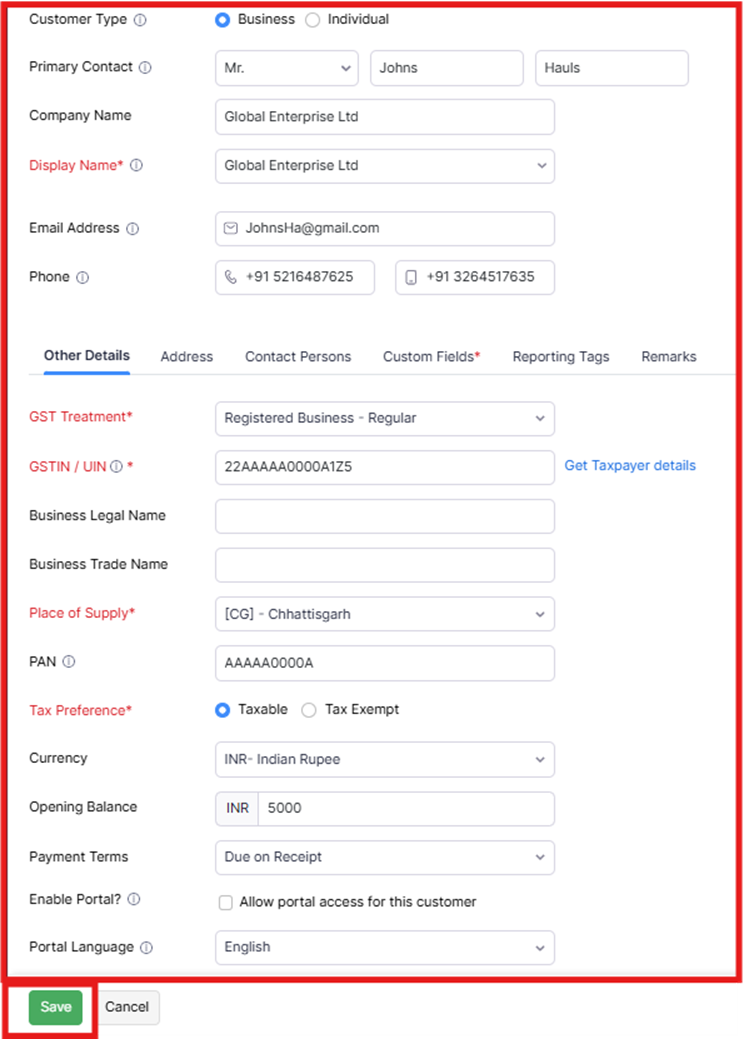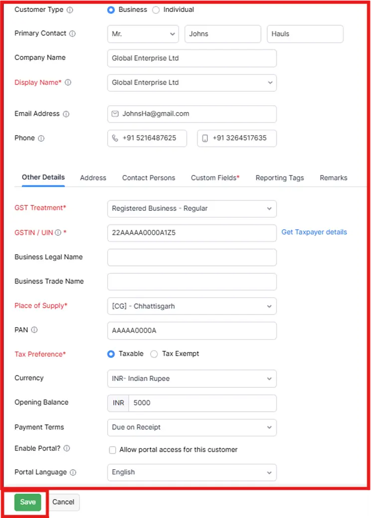 Customer details are added in Zoho Books to store important information about your customers, like their name, contact info, and order history. This helps you manage sales, send invoices, and keep track of payments easily. Adding customer details makes it simple to stay organized and communicate with them.