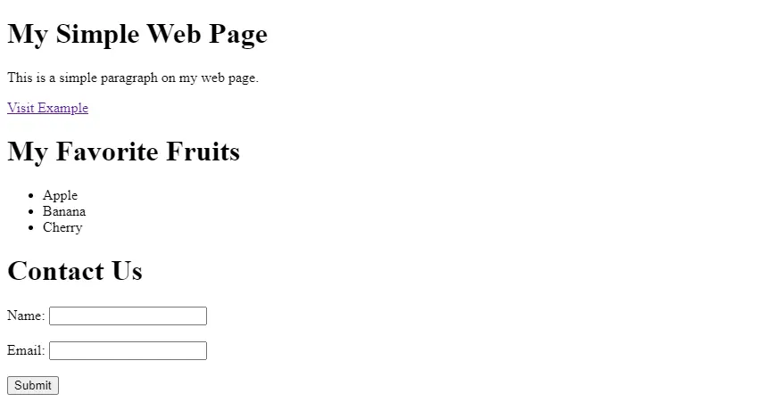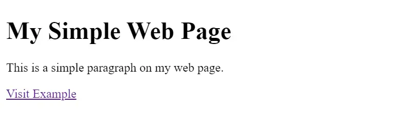 - A paragraph: “This is a simple paragraph on my web page.”, and a link: “Visit Facebook” that points to https://www.facebook.com/