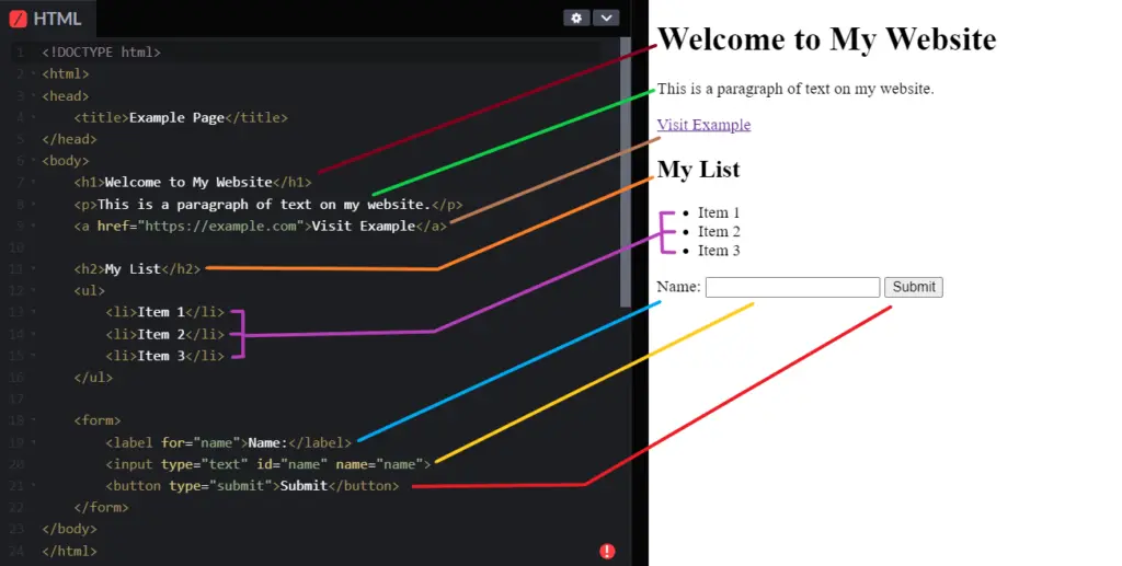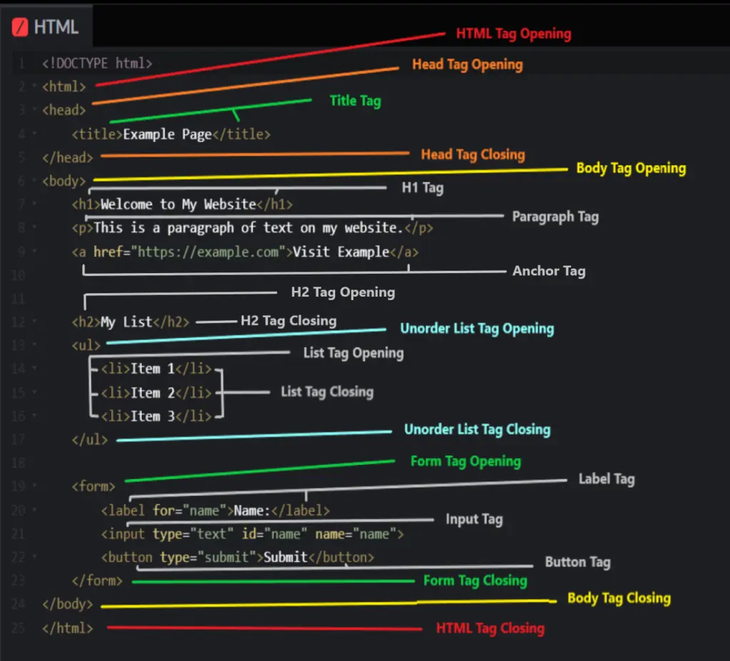 HTML tags tell the browser what kind of content to display and how to display it. Most tags come in pairs: an opening tag and a closing tag. The opening tag starts the element, and the closing tag ends it. You put the content you want to display between these tags. Some tags, like the <br> tag for line break, are self-closing and don’t need a closing tag.