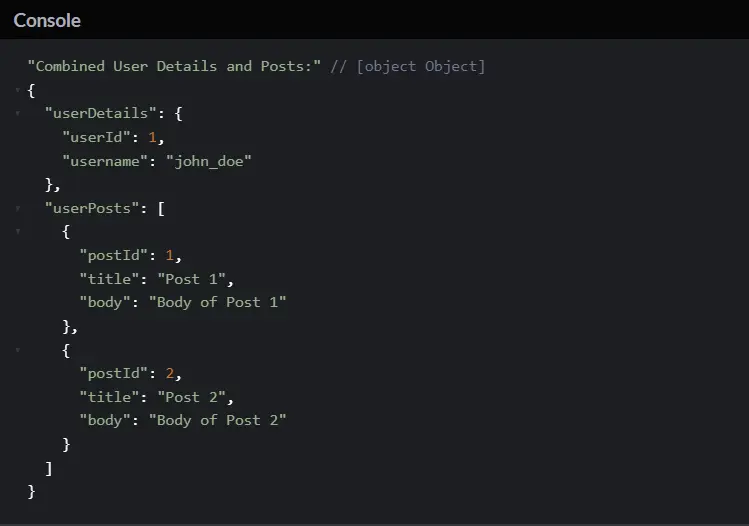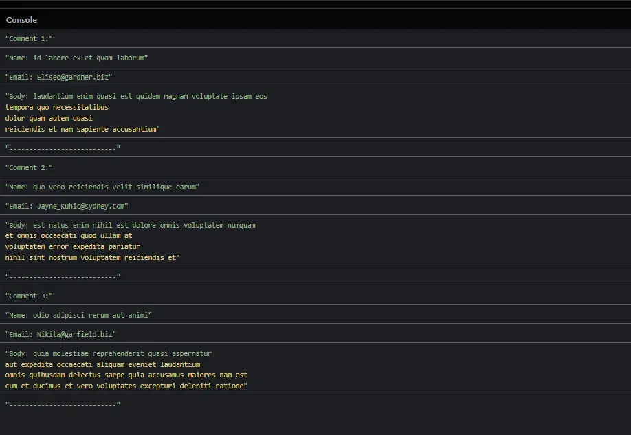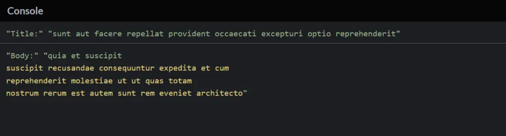 •  The second .then() receives the parsed data and logs it to the console using console.log(). This will log the newly added user, including an ID field (which is auto-generated by the server) and the values you sent.