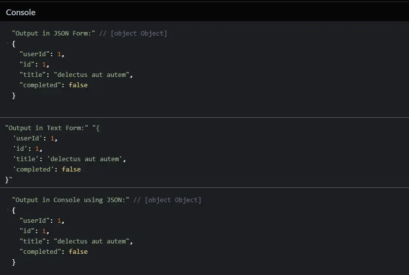 console.log(‘Output in Text Form:’, JSON.stringify(data, null, 2)); // Convert to JSON string with indentation
