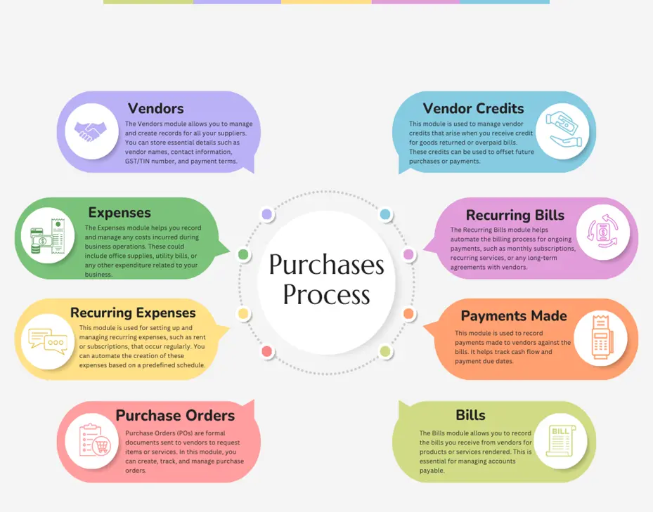 The Purchase Module in Zoho Books is used to manage everything related to buying goods or services for your business. It includes creating and managing Purchase Orders, Bills, Expenses, Vendor Payments, and Debit Notes.