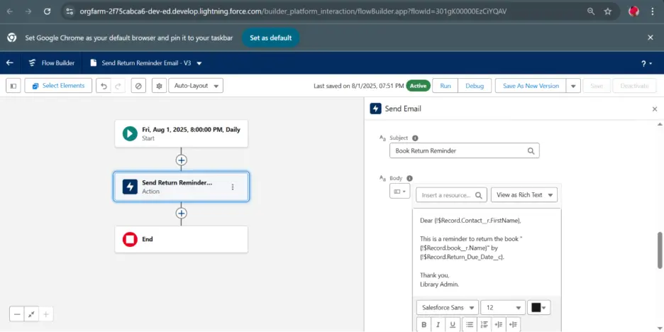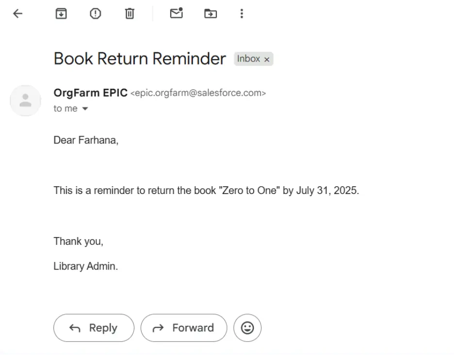 This is a reminder to return the book “{!$Record.book__r.Name}” by {!$Record.Return_Due_Date__c}.