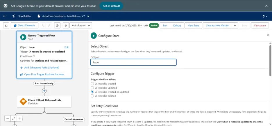 • When to Execute Outcome: Only if the record that triggered the flow to run is updated to meet the condition requirements.