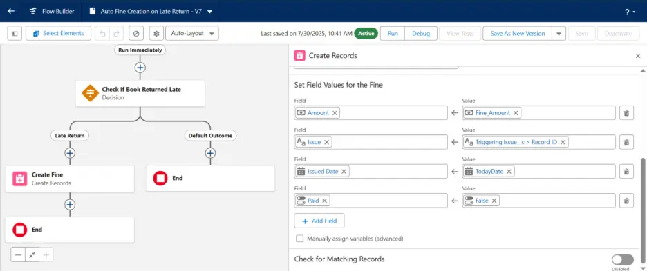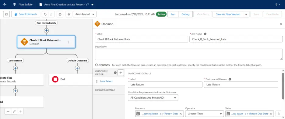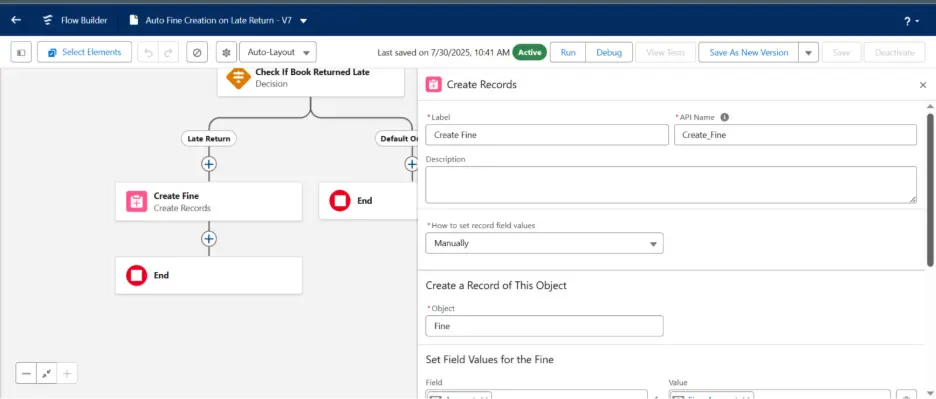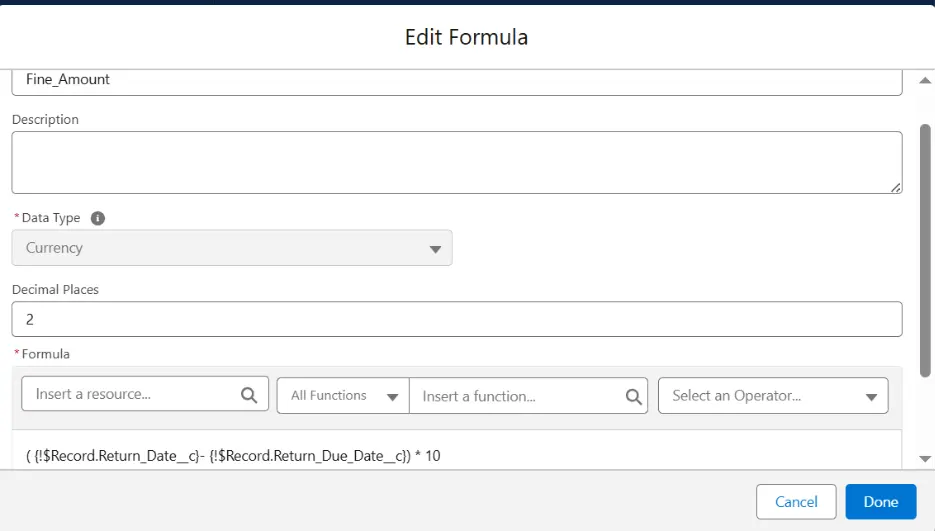 Amount__c | Formula (e.g., 10* (Return_Date__c – Due_Date__c)) |