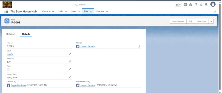 • When a librarian update Returned__c = True, and the Return_Date__c > Due_Date__c,