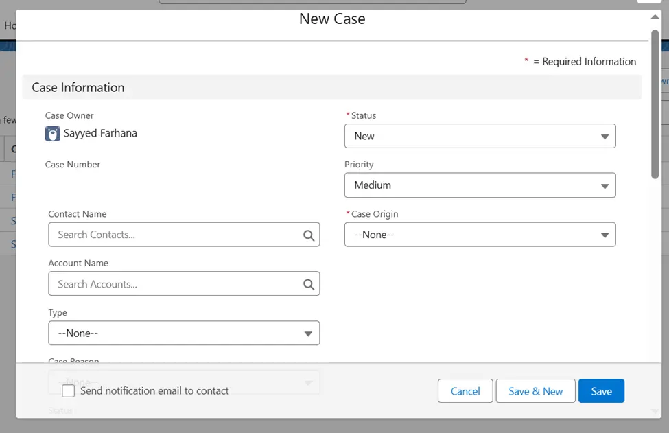 Auto Number | Case Number | NA | (System Generated) Unique identifier for the case. |