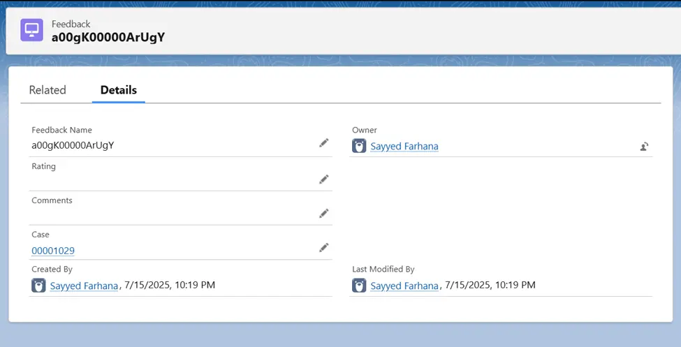 Feedback (Custom): The Feedback__c object is a custom object designed to collect customer feedback after a case is closed. It helps track satisfaction levels and gather comments to improve service quality.