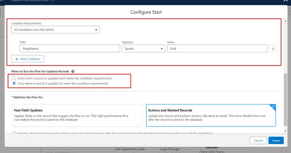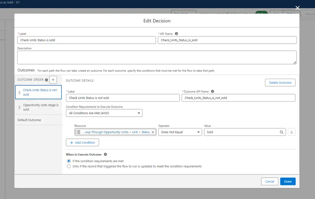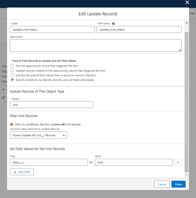 o Filter Criteria: Use the Opportunity ID from the updated record to find related Opportunity unit’s records, and related