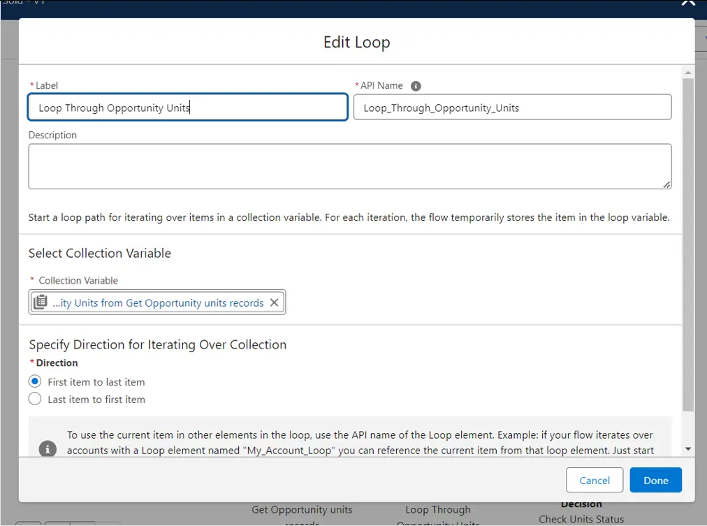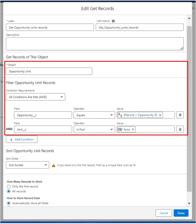 o Add a Get Records element to query the Opportunity units that link the Opportunity and Units.