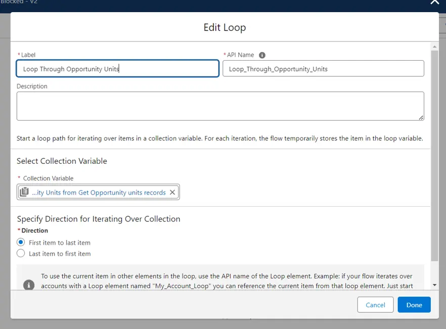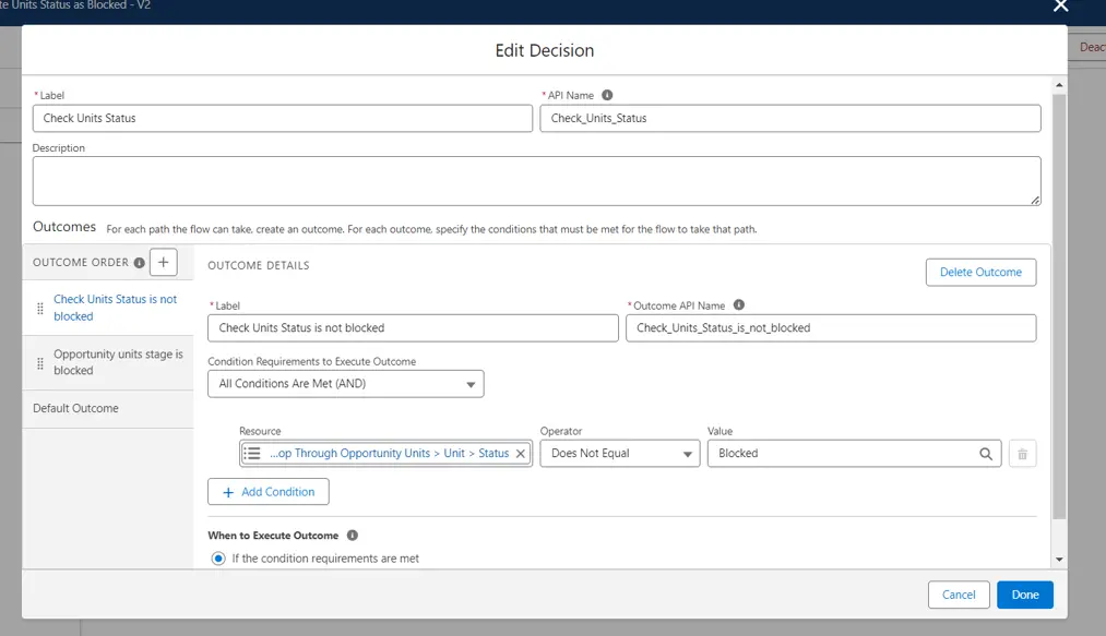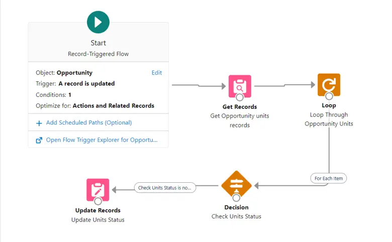 The flow ensures that once an Opportunity reaches certain stages, the related Unit is properly marked as “Blocked.”