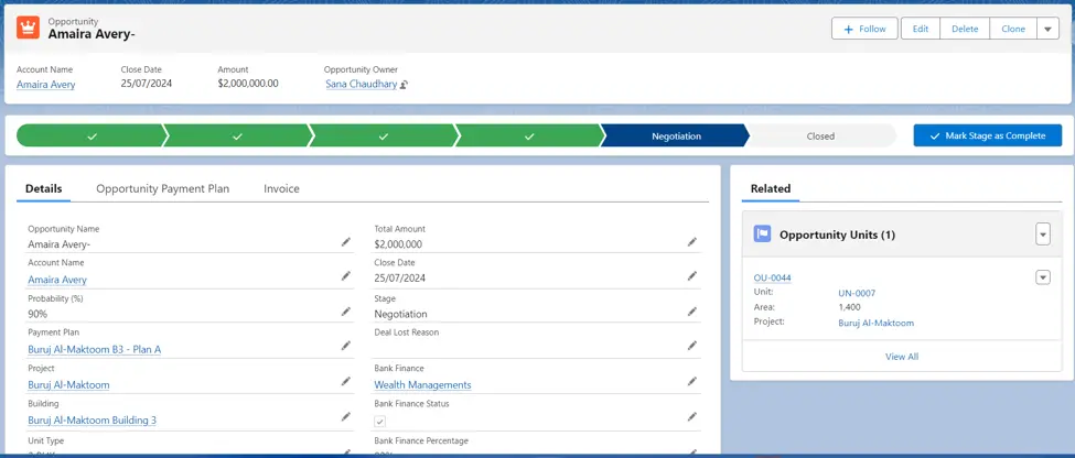 When the Opportunity stage changes to “Bank Finance in Process” or “Negotiation,” the system will automatically check if the related Unit’s stage is not “Blocked.”