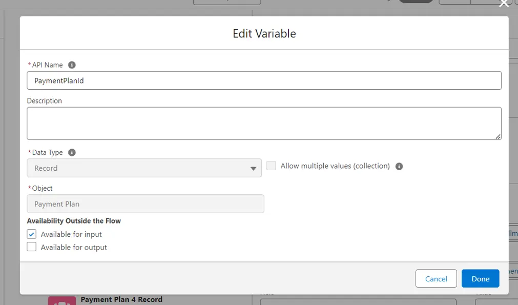 - After that Filled out the API Name, Select Data type as Record and choose Available for Input.