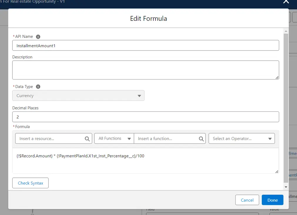 InstallmentAmount1 = {!$Record.Amount} * {!PaymentPlanId.X1st_Inst_Percent__c} / 100 InstallmentAmount2 =