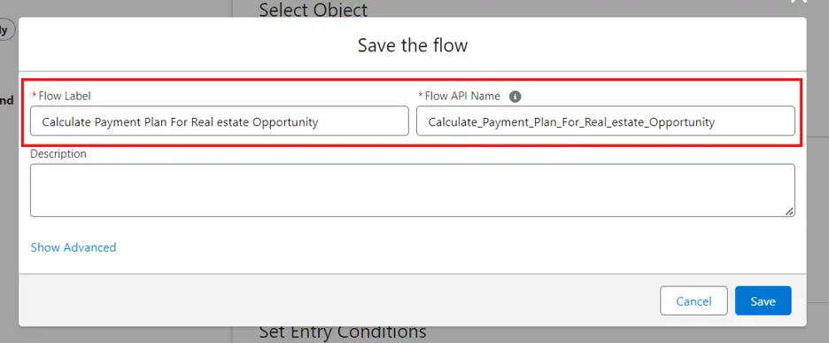 • Specify the condition that triggers the flow. For example, you can set it to run when a payment plan field is updated