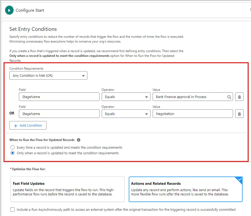 • Set the flow to trigger when a record is created or updated on the Opportunity object.