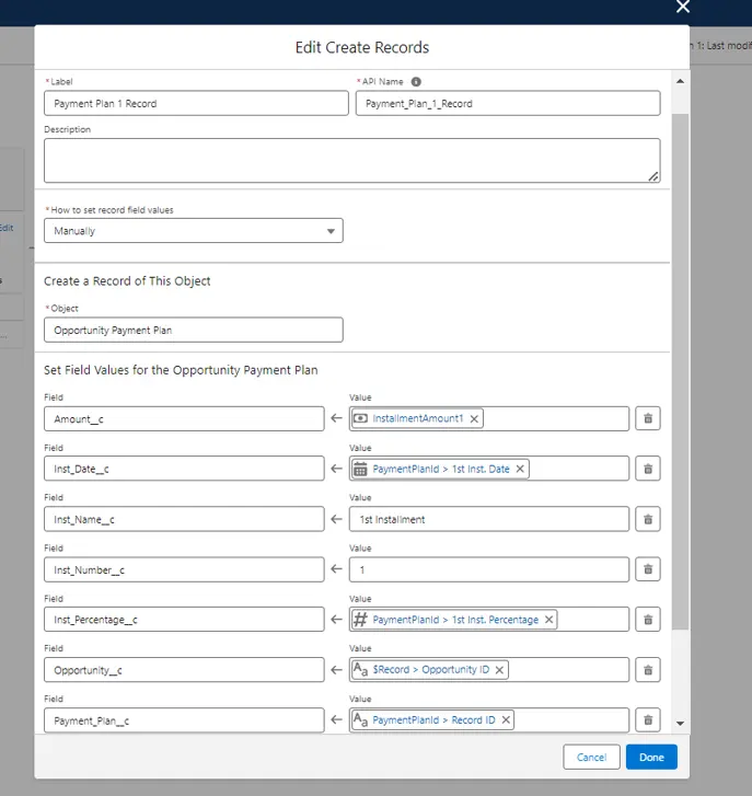 Add Details: Include the installment name, date, and link each Opportunity Payment Plan to the related