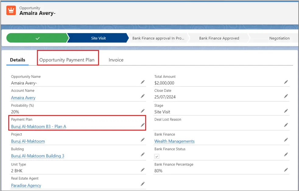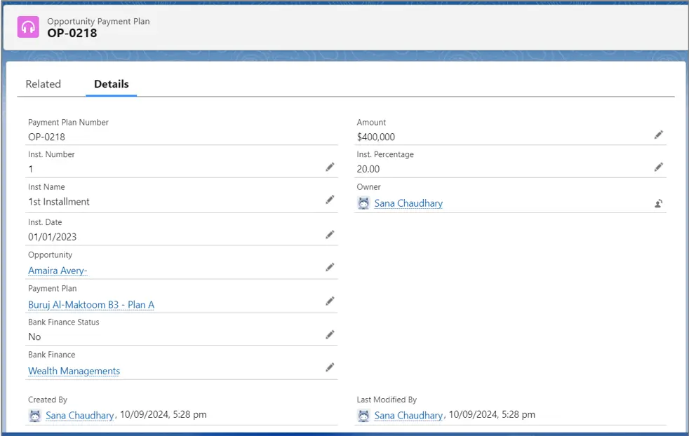Once the Payment Plan is added and record is saved, An Opportunity Payment Plan will be created to capture and manage the payment details for the opportunity.