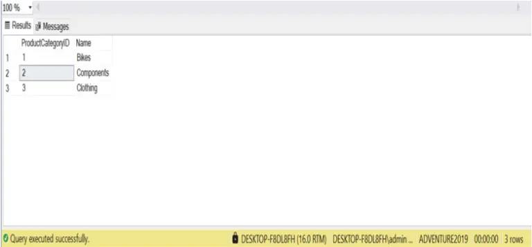 3. Write SQL Query to get ProductCategory, Name from Production.ProductCategory table where ProductCategoryID from 1 to 3.