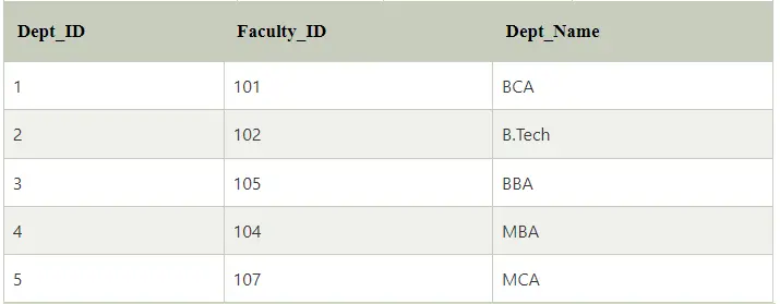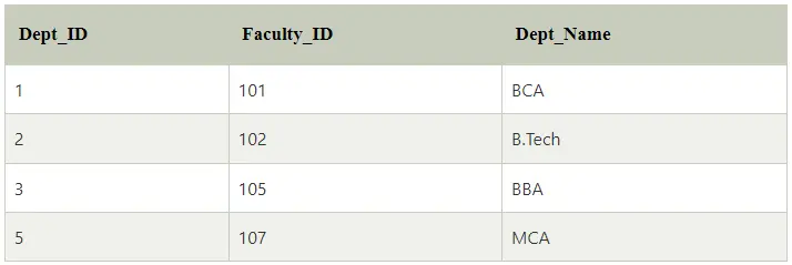 Let’s take the following two tables named Faculty_Details and Department tables.