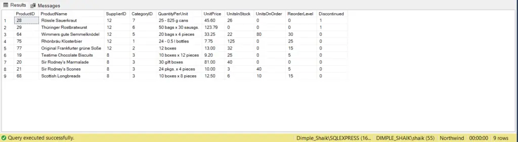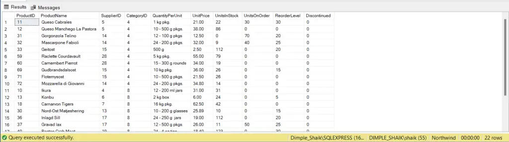 9. Write a query to get all product records whose category is ‘Dairy products’, or ‘seafood’. [output: 22 rows]