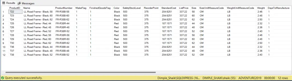 6. Compose a SQL query to retrieve all production products from the database, focusing specifically on those associated with the product model named ‘LL Road Frame’. [12 ROWS]