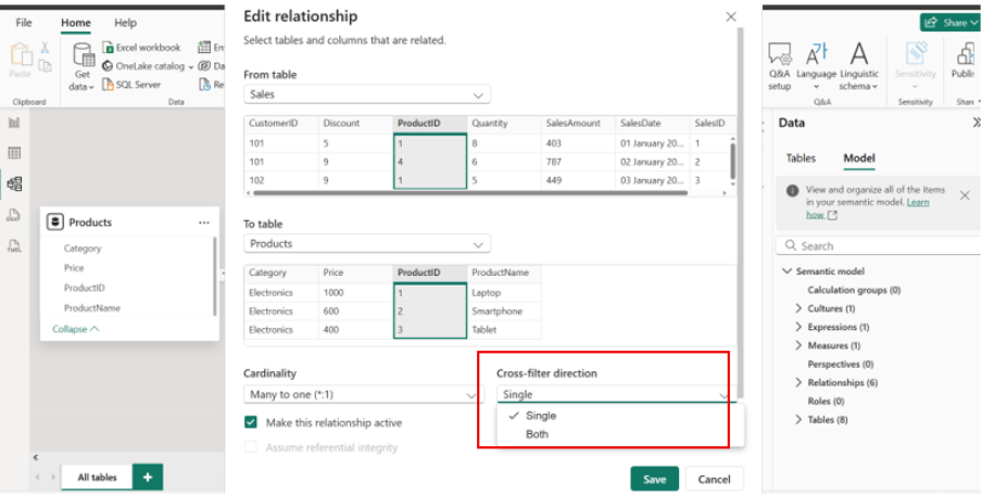 When two tables are connected in Power BI, cross filter direction controls how filtering works between them.