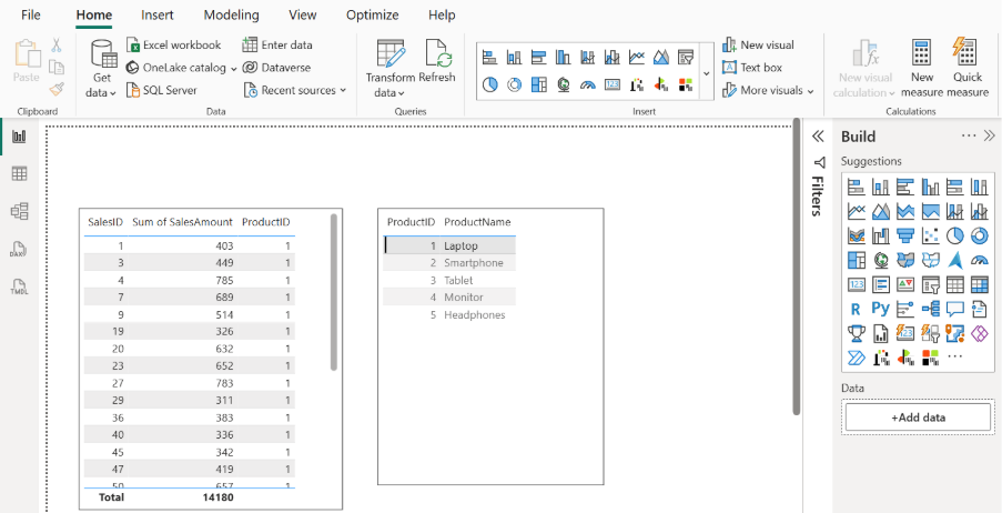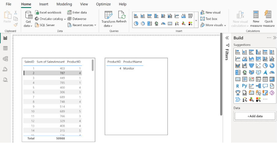 - Example: Take two table visuals from build and add Sales ID, Amount and Product ID in first table. Add Product ID and Product Name columns in second table.