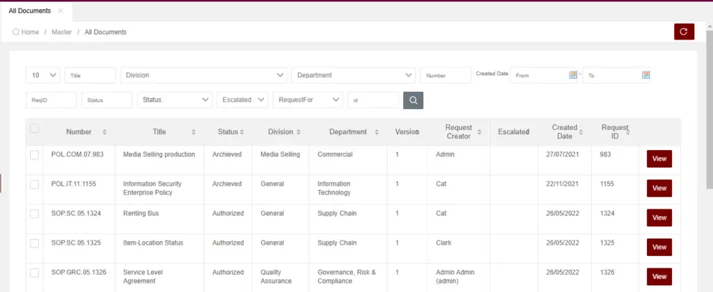 ⦁ Intuitive dashboards for quick navigation and real-time insights on policies, SOPs, work instructions, forms, templates, and DOA.