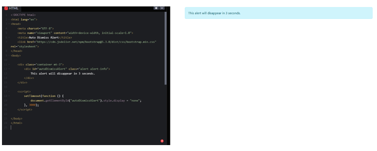 setTimeout() – Hides alert after 3 seconds.