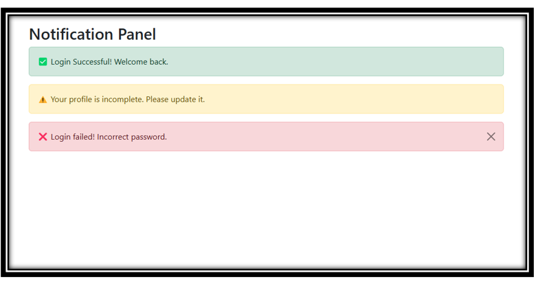 | .alert-danger | Shows errors or warnings (e.g., “Login failed!”) |