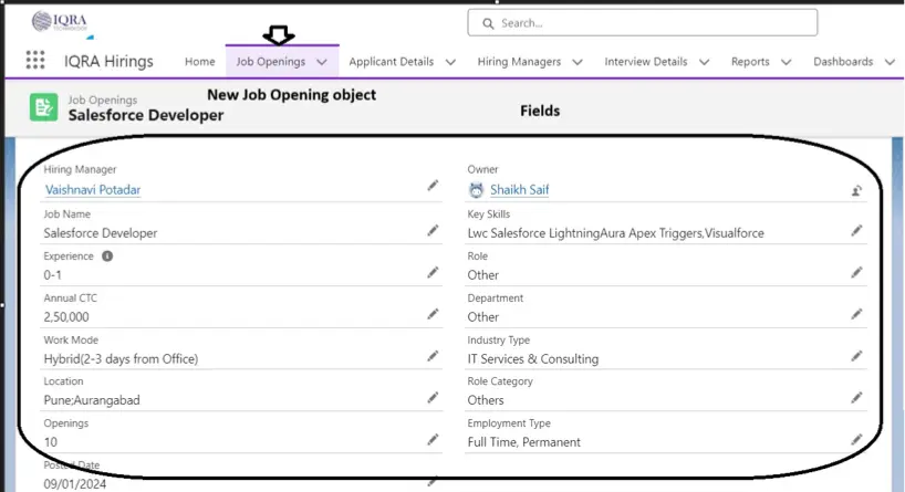 Scenario 3: – IQRA Tech is a growing company that wants to make hiring new employees easier. They want to keep track of everyone who applies to work at their company in one place. They plan to use Salesforce to create a system where they can store information about each job candidate.