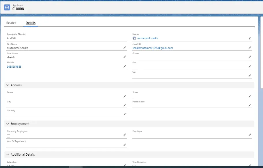 • Define Fields: First Name, Last Name, Email, Phone Number, Address, Educational Qualifications, Work Experience, Skills and Expertise, Interview Feedback, Status (e.g., New, In Progress, Hired, Rejected)