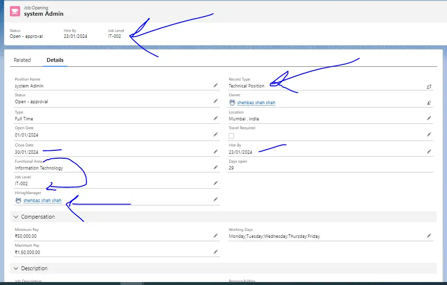 Solution: – Step 1. Create a custom object named “Job Opening” in Salesforce Step 2. Define Fields job role, job title, department, responsibilities, required qualifications, and salary range.