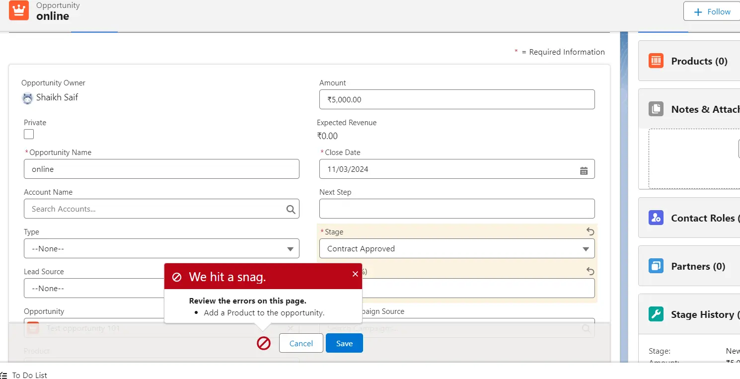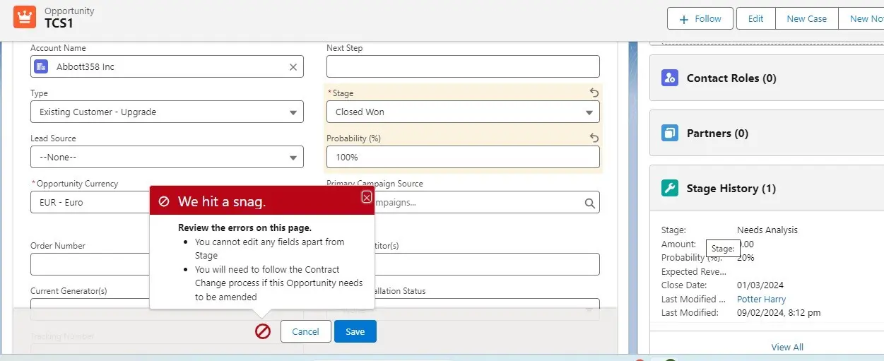 display an error. The rule ensures that the “Amendment” stage can only be assigned from the “Closed Won” stage.