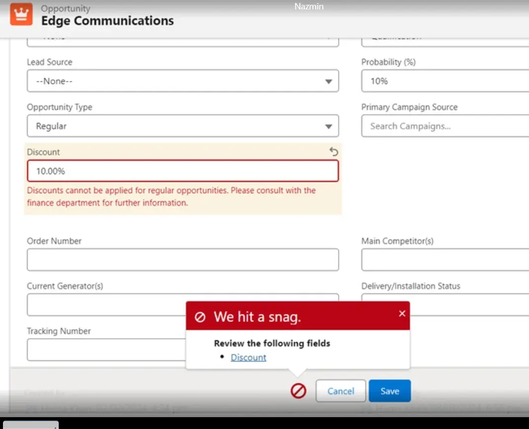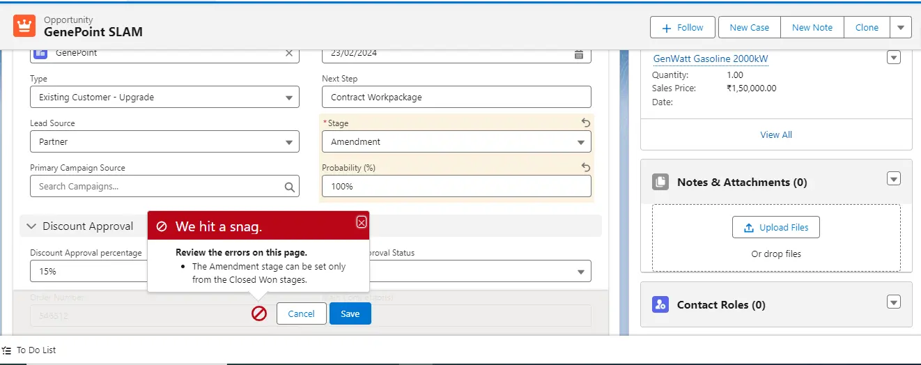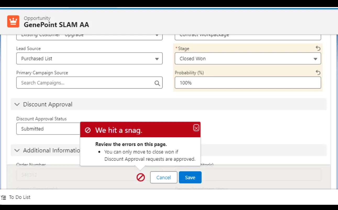 “Closed Won,” a validation error should occur. The validation rule ensures that opportunities cannot be marked as “Closed Won” unless their associated discount approval status has