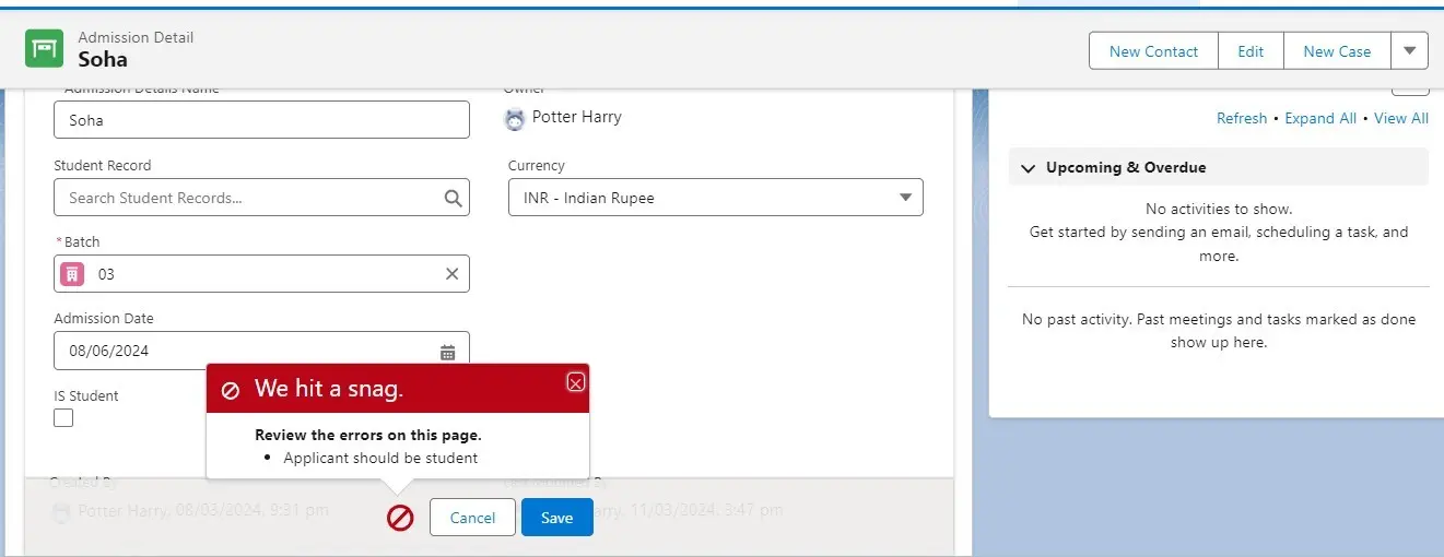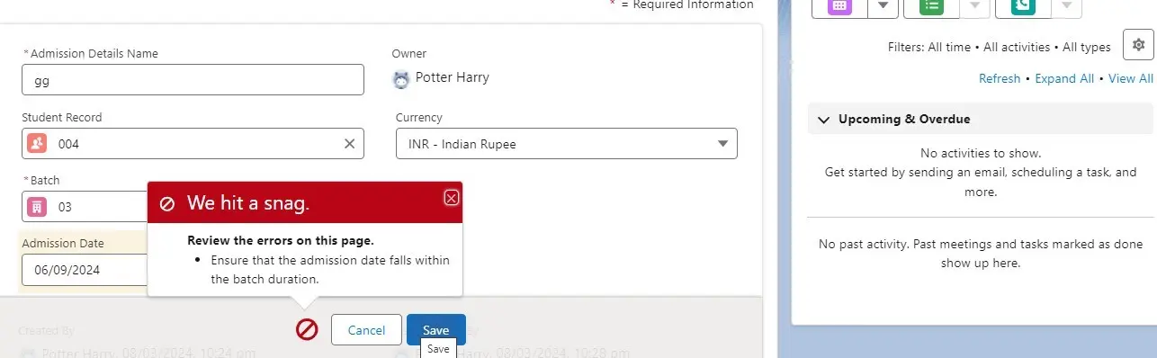 Step 4: Create the validation rule for admission date is in between batch start date and end date.