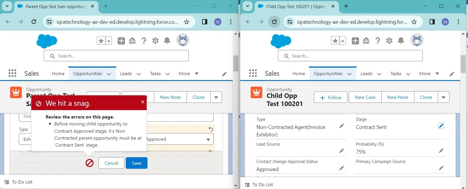 Scenerio 13:- Before moving child opportunity to the Contract Approved stage, its Non Contracted parent opportunity must be at the ‘Contract Sent’ stage but the opportunity type must be non-contracted
