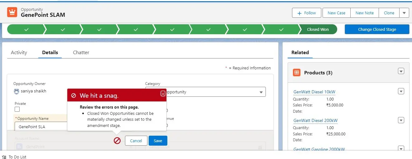 “Amendment.” Once an opportunity is marked as “Closed Won,” it becomes locked, meaning it cannot be edited by the sales user. if user want to make some changes to opportunity, it should get a validation error Closed Won Opportunities cannot be