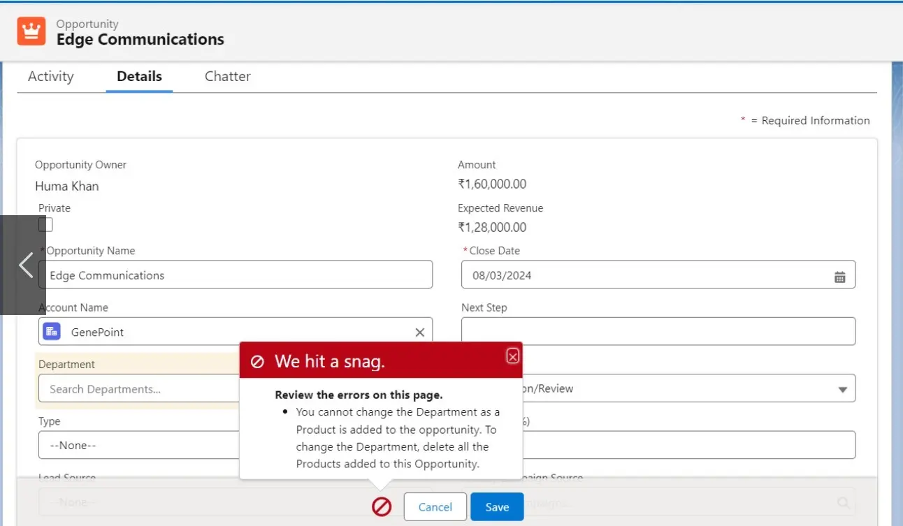 5. Display Error: ‘You cannot change the Department as Product is added to the To change Department delete all the Products added to this Opportunity.
